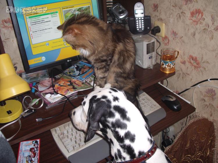 А у нас аж два далматина.Мои их принимают за леопардов(я так думаю) и пытаются на них охотится.